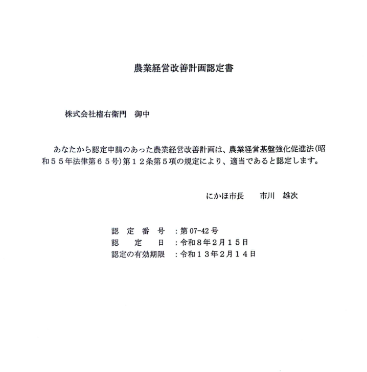 にかほ市長より弊社が計画した5カ年農業経営改善計画が認められ
